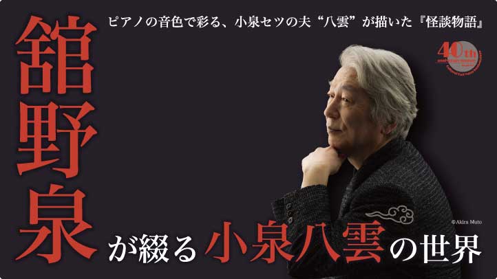 怪談作家“小泉八雲”。彼が、日本人の精神性や日常の中にある美しさを愛したことはご存じだろうか?それは、執筆した小説を通じて海外に伝わった。そんな彼の物語を、左手のピアニスト“舘野泉”がピアノの音色と語りで表現し、皆を八雲の世界へいざなう。盟友“ペール・ヘンリク・ノルドグレン”が作曲した名曲と共に、お楽しみください。