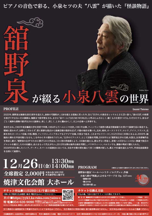 怪談作家“小泉八雲”。彼が、日本人の精神性や日常の中にある美しさを愛したことはご存じだろうか?それは、執筆した小説を通じて海外に伝わった。そんな彼の物語を、左手のピアニスト“舘野泉”がピアノの音色と語りで表現し、皆を八雲の世界へいざなう。盟友“ペール・ヘンリク・ノルドグレン”が作曲した名曲と共に、お楽しみください。